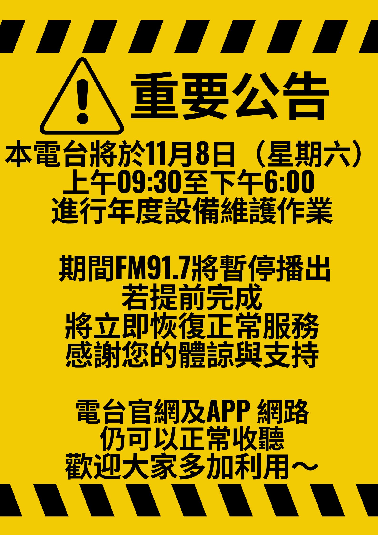 11/8(六) 09:30-18:00 因年度設備維護作業暫停訊號播送